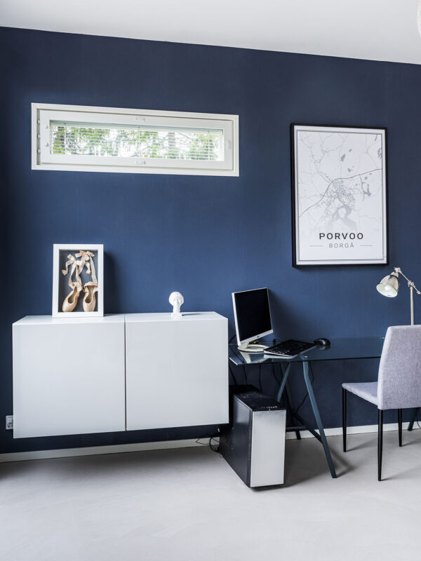 Lisäksi pariskunta kävi tarkoin läpi muun muassa kodin kulkureittejä ja käytännöllisti niitä. Töistä ja pihalta sisälle tullessa on hyvä päästä suoraan kodinhoitohuoneeseen pesukoneen ääreen. Ja kun terassin toimintoja hahmoteltiin, tarvittiin sinne paikka grillille, joten liukuovi siirtyi sivummalle ja työhuoneen uloskäynti vaihdettiin keittiön kohdalle.